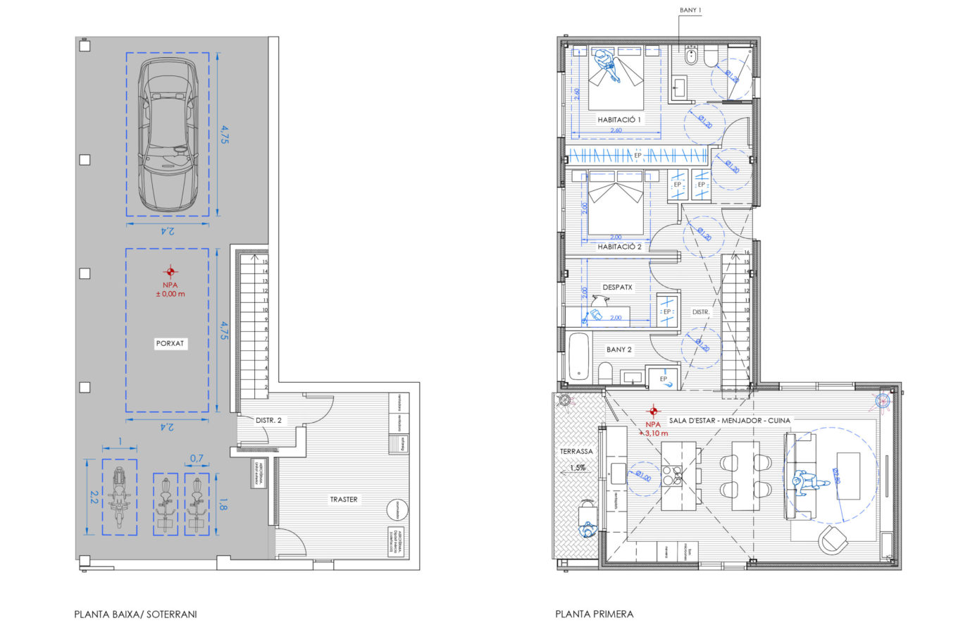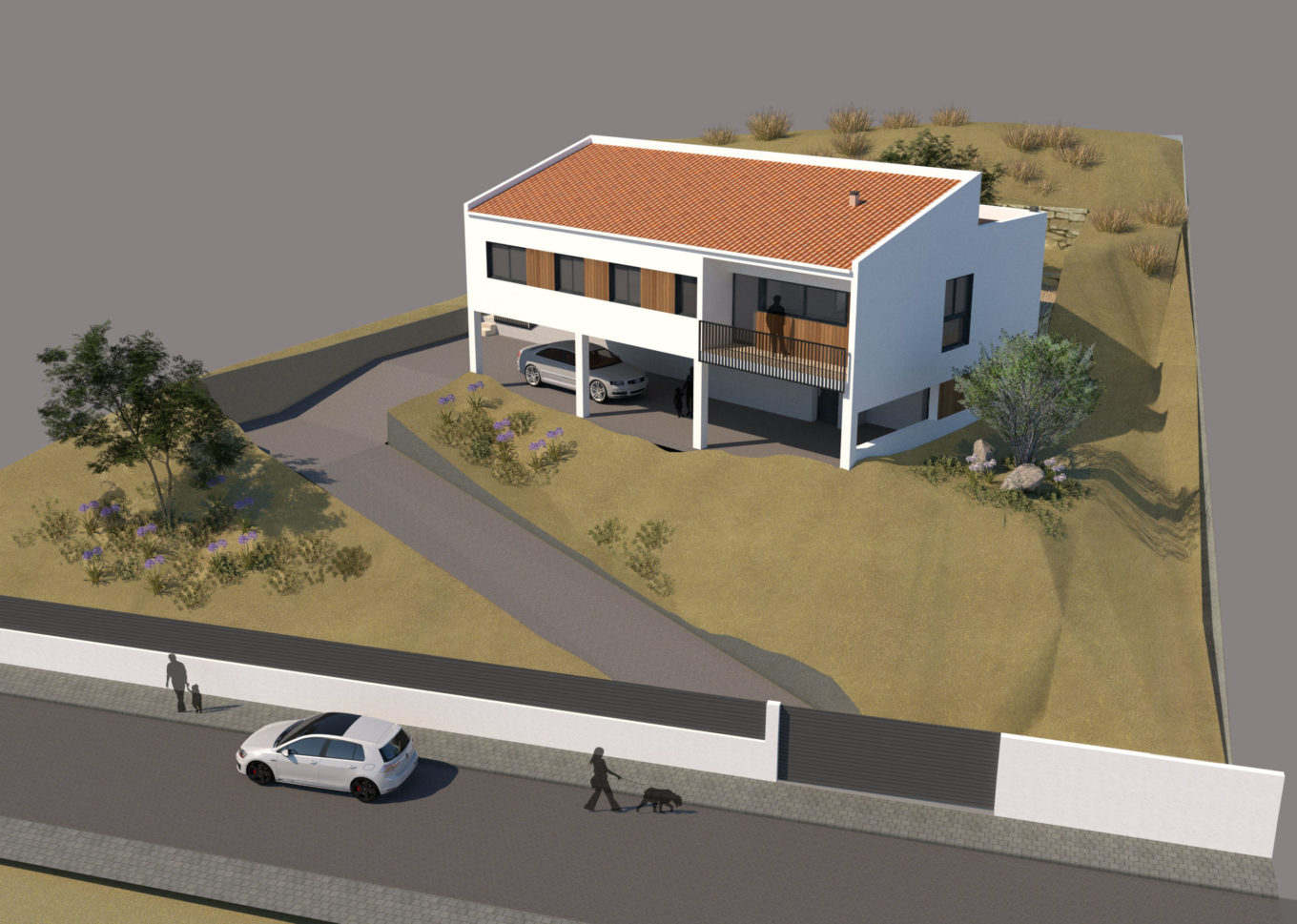 Donades les circumstàncies, el conjunt s’ha estructurat en un volum de dos nivells en forma de ‘L’. Al nivell superior s’hi col·locarà el programa de la vivenda, comptant amb àmbits a doble alçada per donar un caràcter diàfan als espais. Al nivell inferior s’hi col·locarà un traster i un porxat amb ús de garatge, espais que (el dia de demà) permetran ampliar l’habitatge.