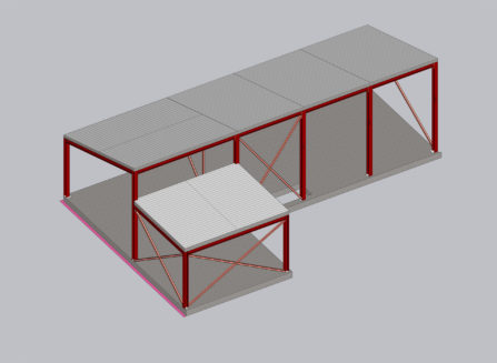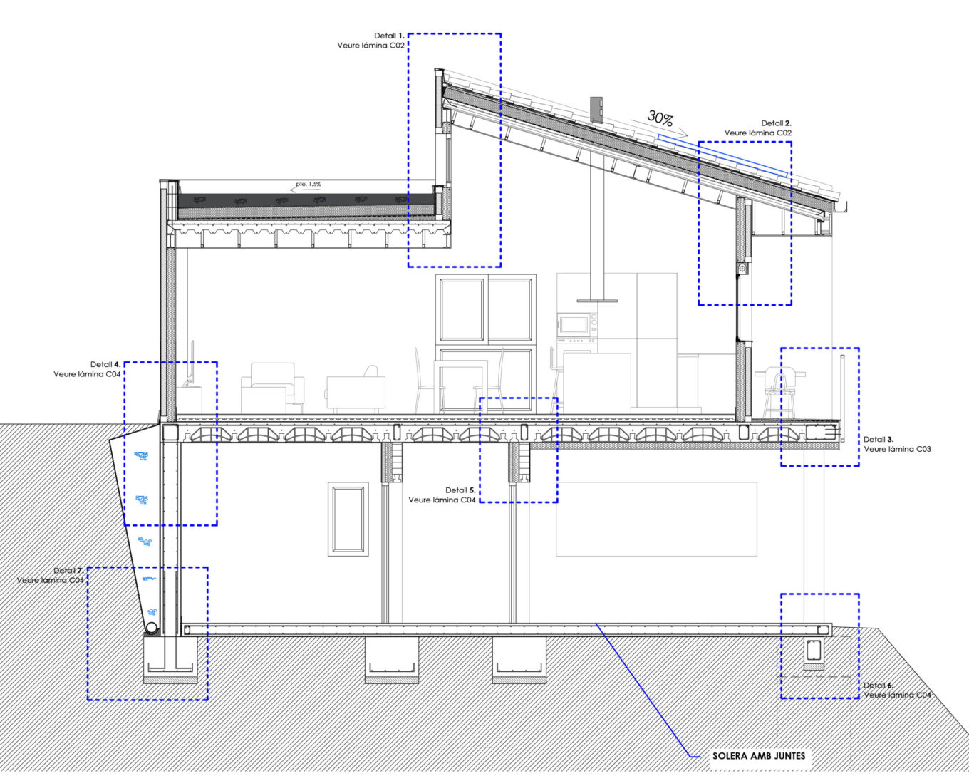 Aquests dos nivells també s’han diferenciat en temes estructurals. El nivell inferior s’executarà a partir d’elements de formigó armat. El nivell superior, per contra, s’executarà a partir d’elements prefabricats d’acer, ja que els tancaments verticals de l’habitatge seran de panells prefabricats de formigó.