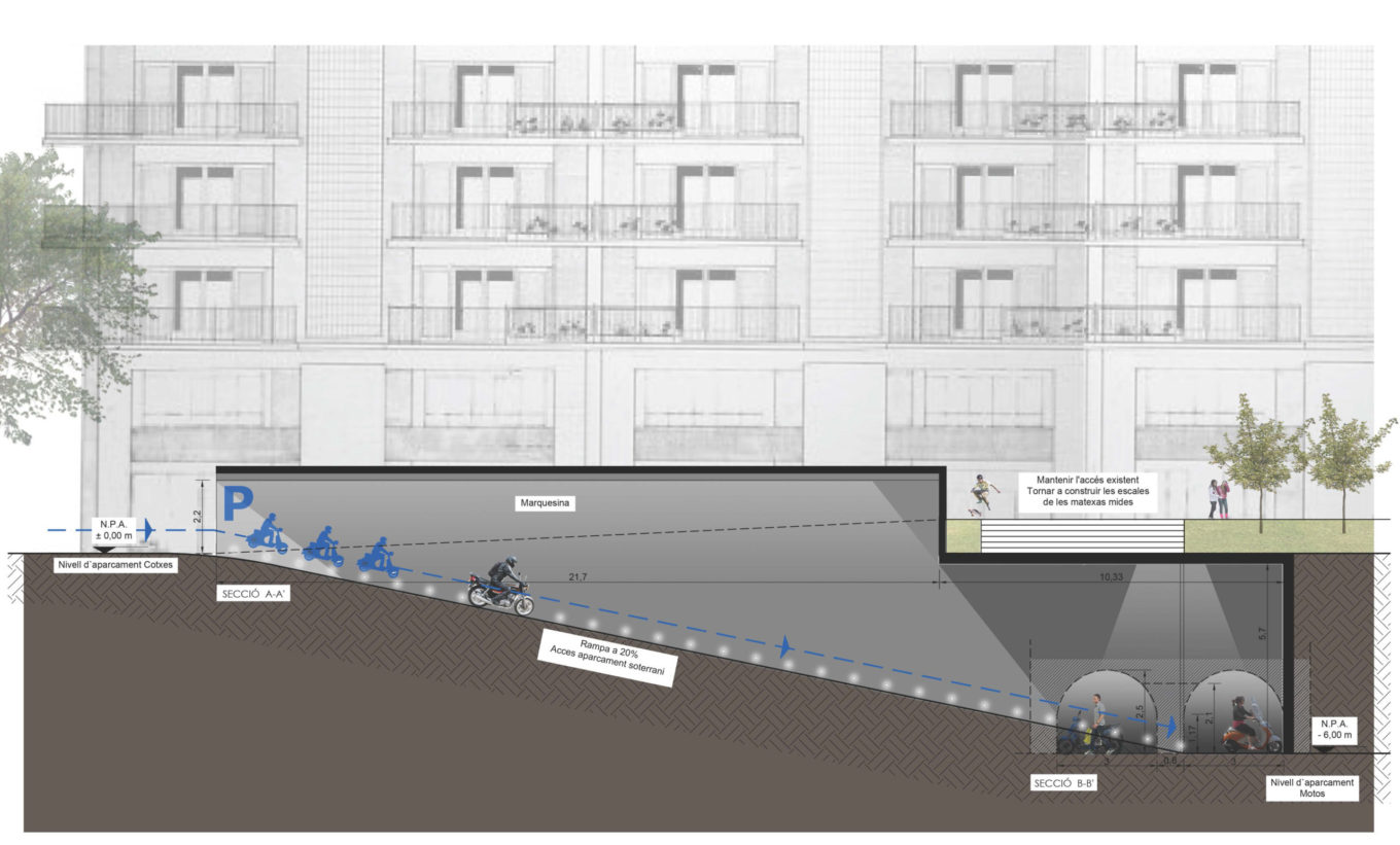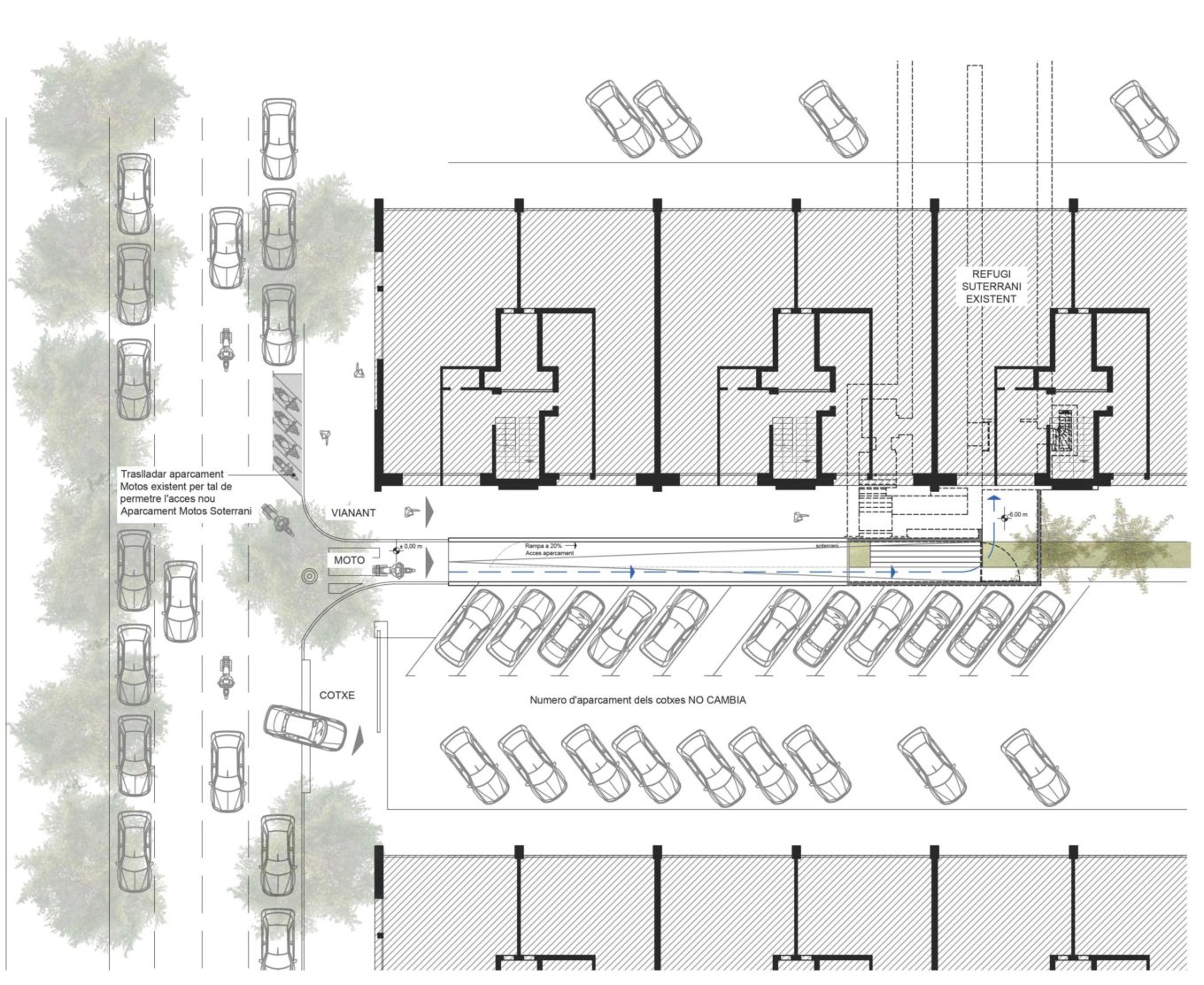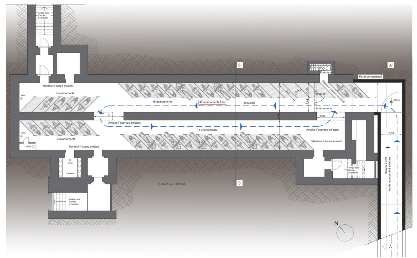 Amb els anys aquest refugi subterrani havia quedat en desús, pel que la intervenció proposa establir-hi 42 noves places d’aparcament per donar-li un nou profit. El projecte també planteja el disseny i el càlcul de la nova rampa d’accés des del nivell del carrer i, a més a més, replanteja el disseny de l’aparcament en superfície preexistent.