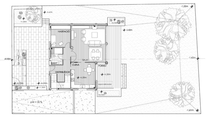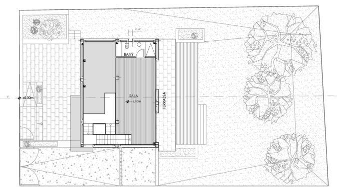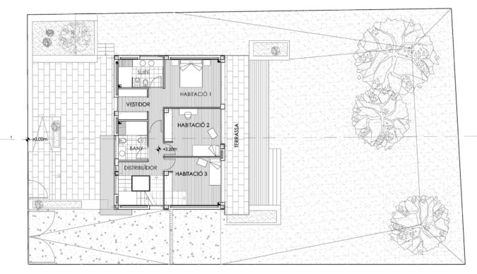 La distribució interior de l’habitatge s’ha plantejat perquè tots els espais puguin gaudir de les vistes al jardí posterior. En aquest sentit, en aquesta orientació s’han situat grans obertures i un porxat per poder garantir i potenciar la relació entre l’interior i l’exterior.