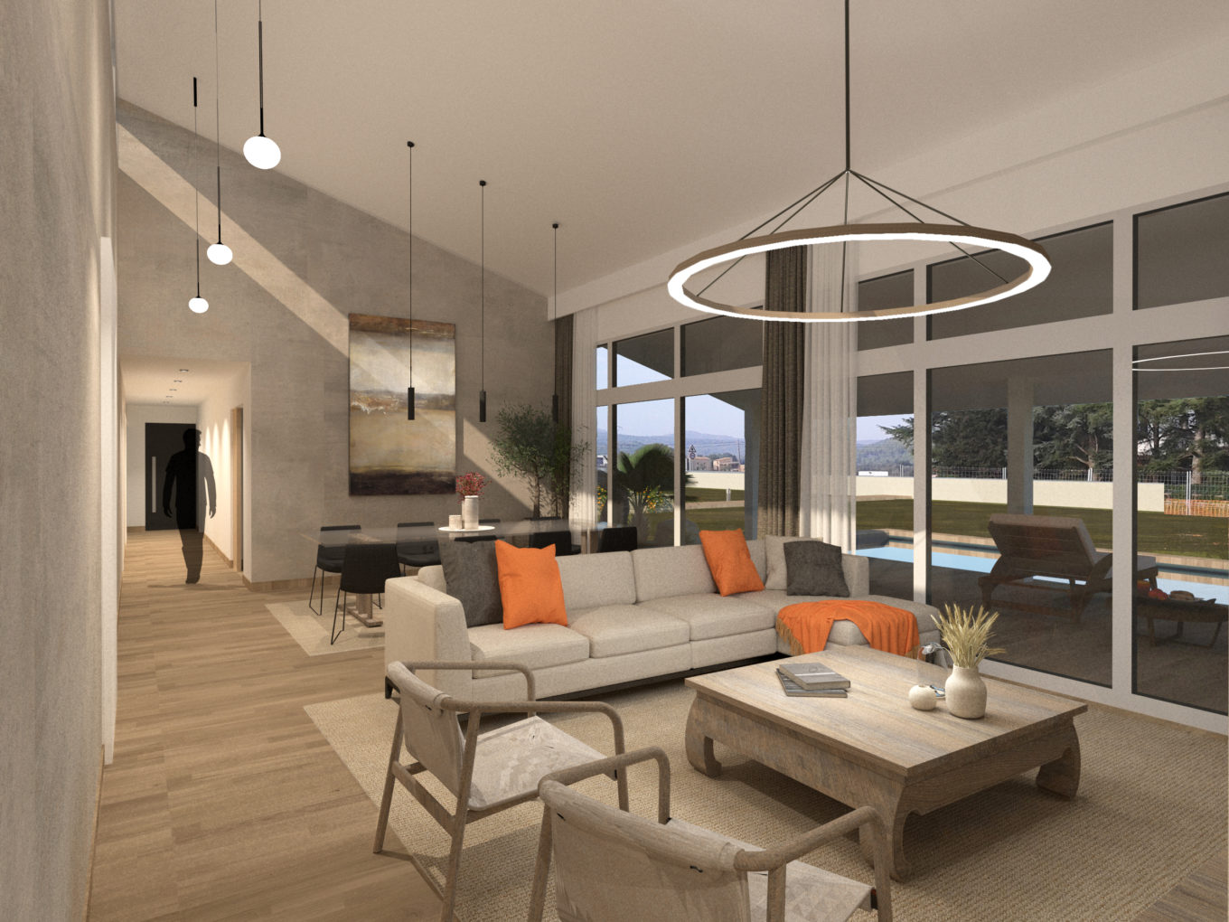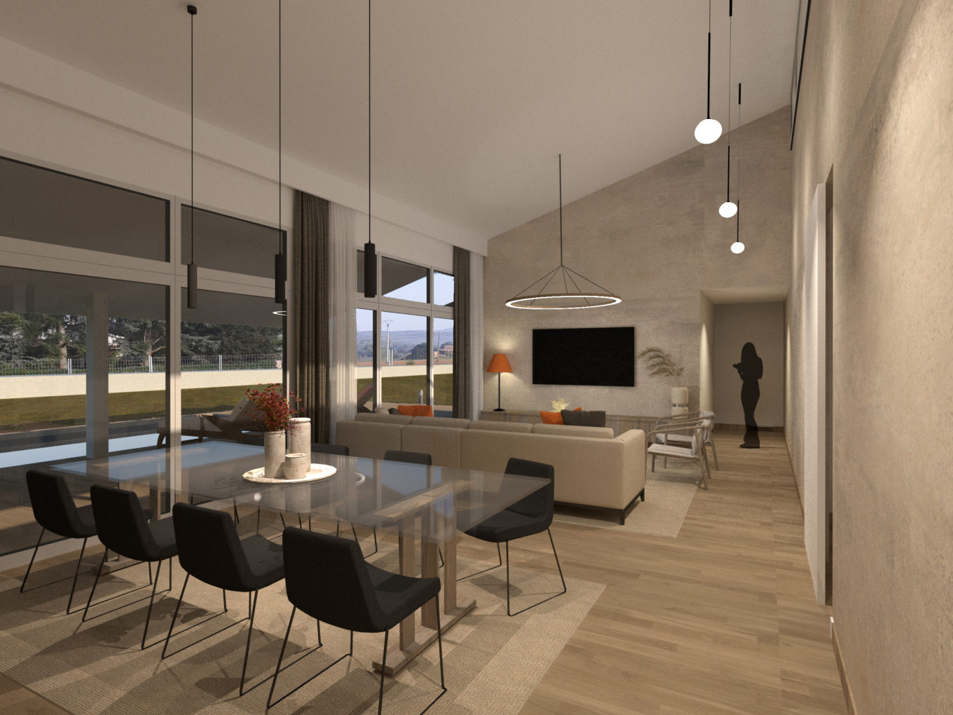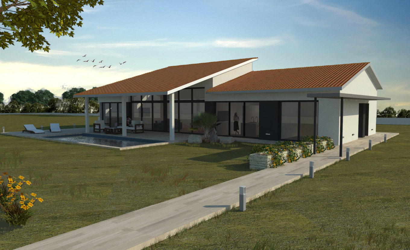 En aquest projecte la sala d’estar serà el cor de l’habitatge, pel que s’ha plantejat la seva prolongació cap a l’exterior amb la inclusió d’un porxat de grans dimensions que emfatitza, encara més, la importància d’aquest espai central.