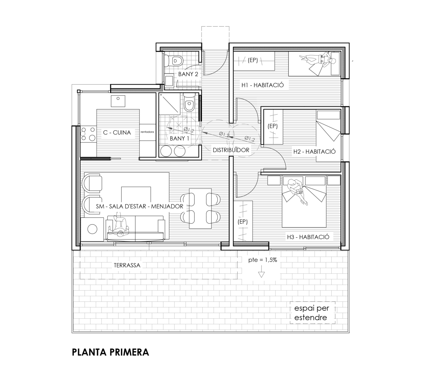 La proposta planteja un habitatge d’una sola planta, configurat a partir de dos volums prismàtics superposats. Un d’aquests volums, on es situaran les zones de dia, s’ha dissenyat a doble alçada per donar a l’espai un caràcter més diàfan.