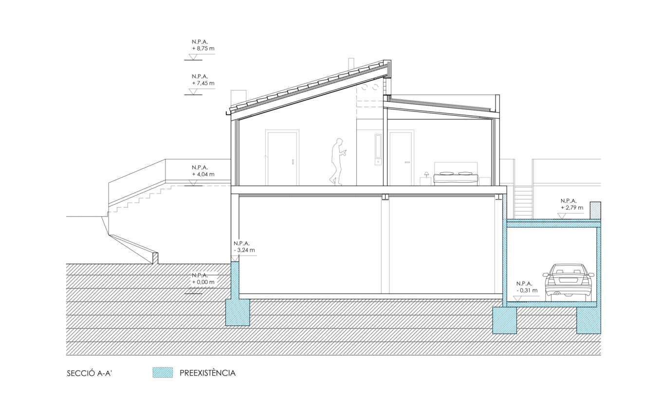 Els clients d’aquest projecte van adquirir una finca per construir-s’hi un petit habitatge. La finca ja comptava amb uns murs de contenció i un garatge construïts, pel que la nova vivenda s’ha dissenyat per col·locar-se sobre d’aquestes preexistències.
