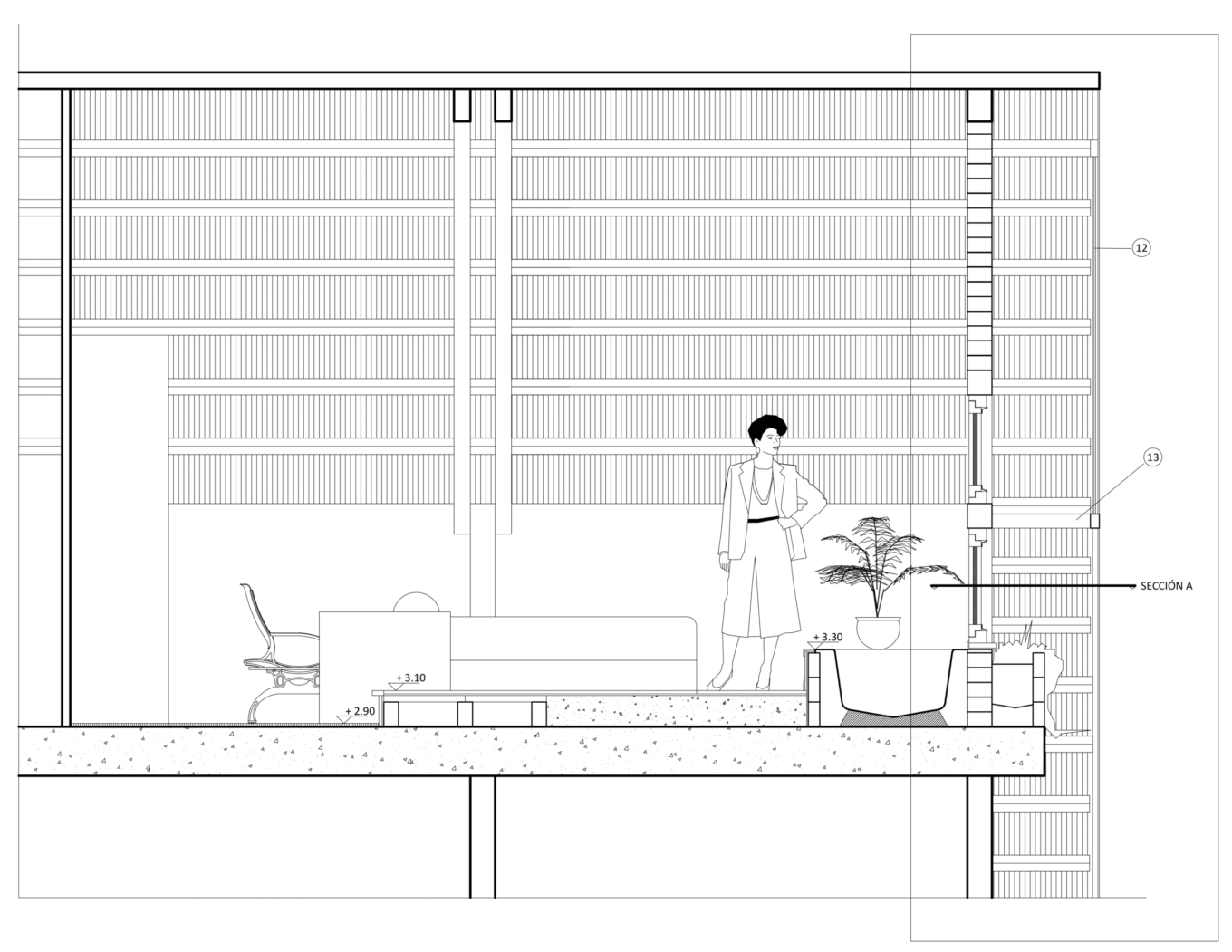 En aquest àmbit s’ha plantejat la incorporació d’una nova estructura lleugera de fusta, tant als nous tancaments de façana com ala coberta, per donar un nou caràcter rústic a l’edifici. Aquesta estructura, a més, ha incorporat un conjunt d’obertures panoràmiques per garantir les vistes al jardí i l’entrada de llum natural.