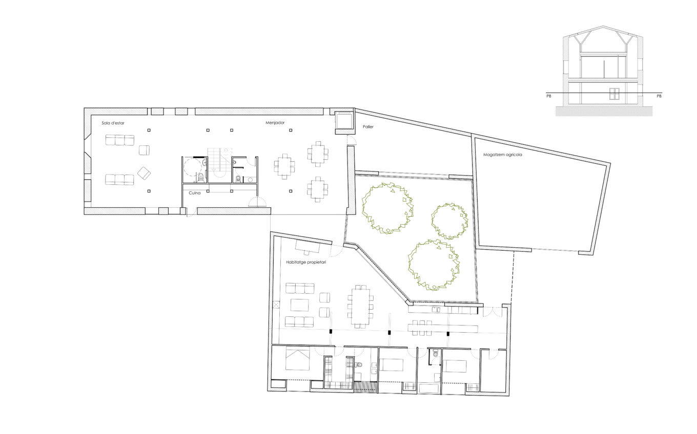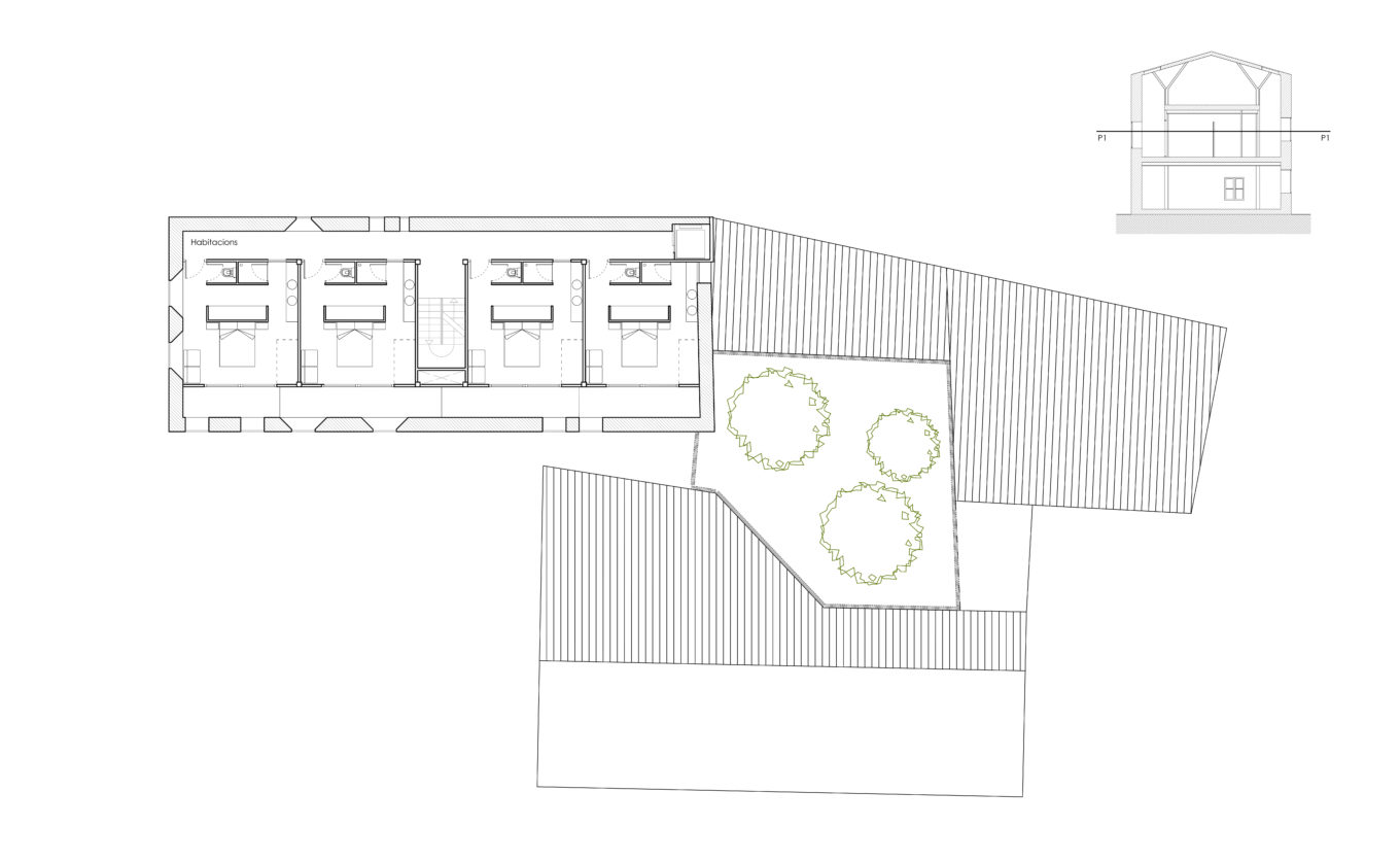 En el edificio principal, configurado en tres plantas, se sitúan los espacios propios de la actividad rural: en las plantas baja y segunda se ubican los espacios de uso común (comedor, cuarto de estar, cocina), mientras que en la planta primera se ubican las habitaciones de los huéspedes.