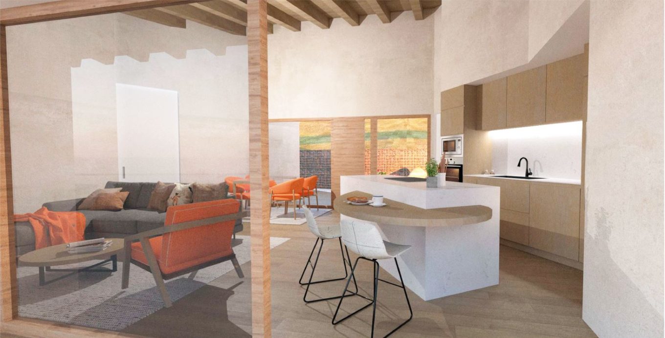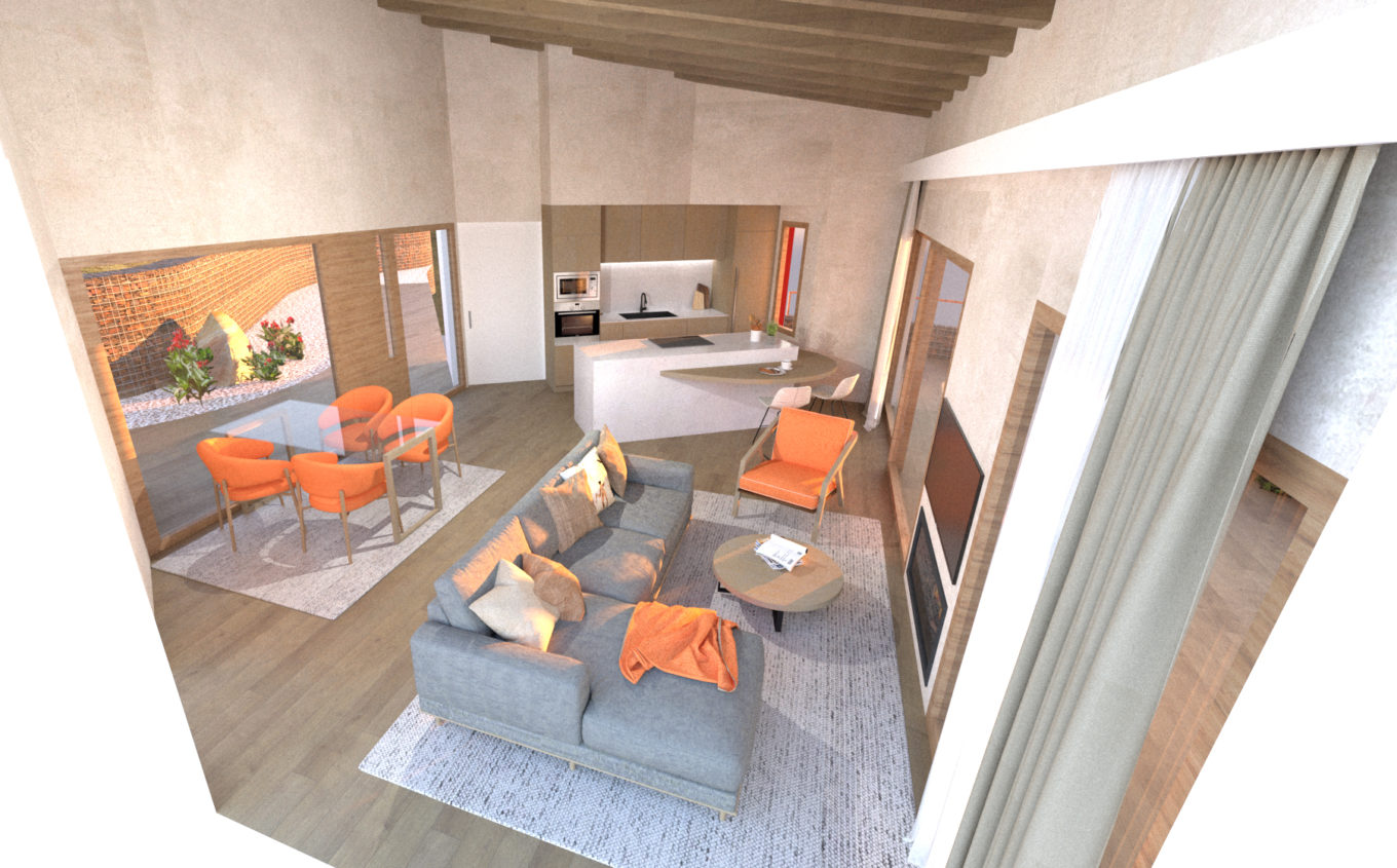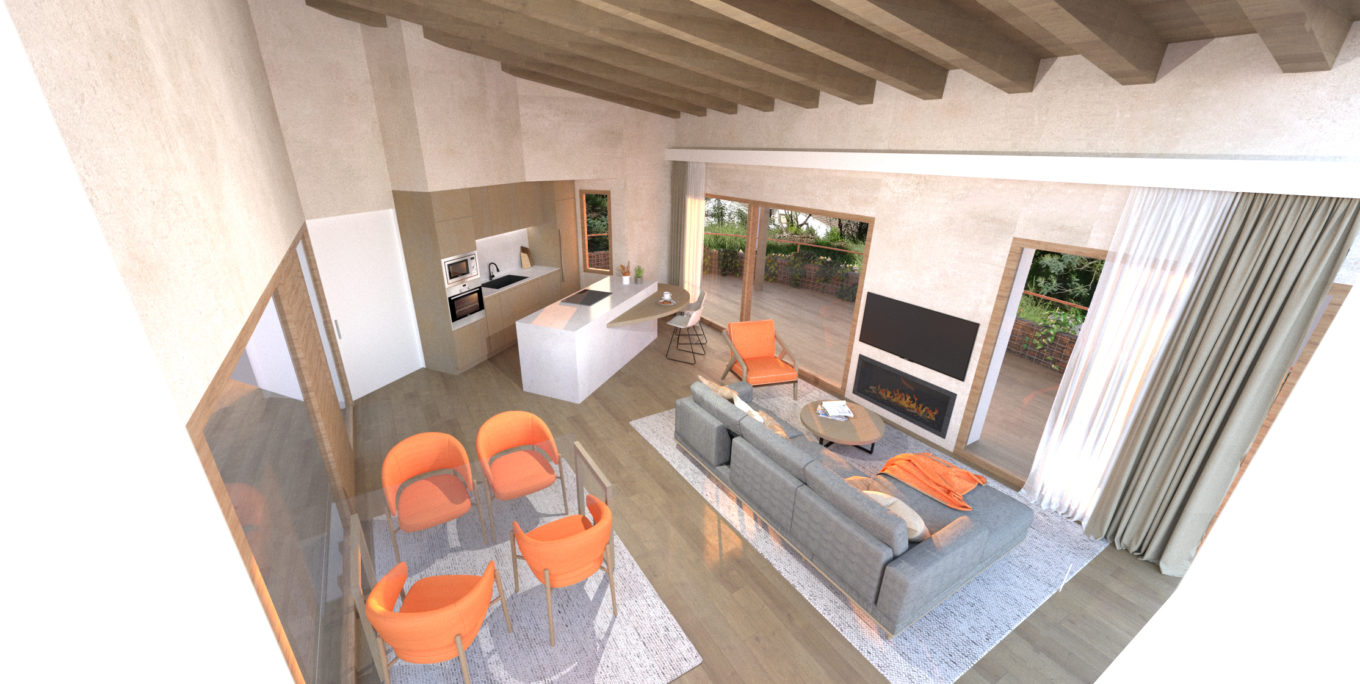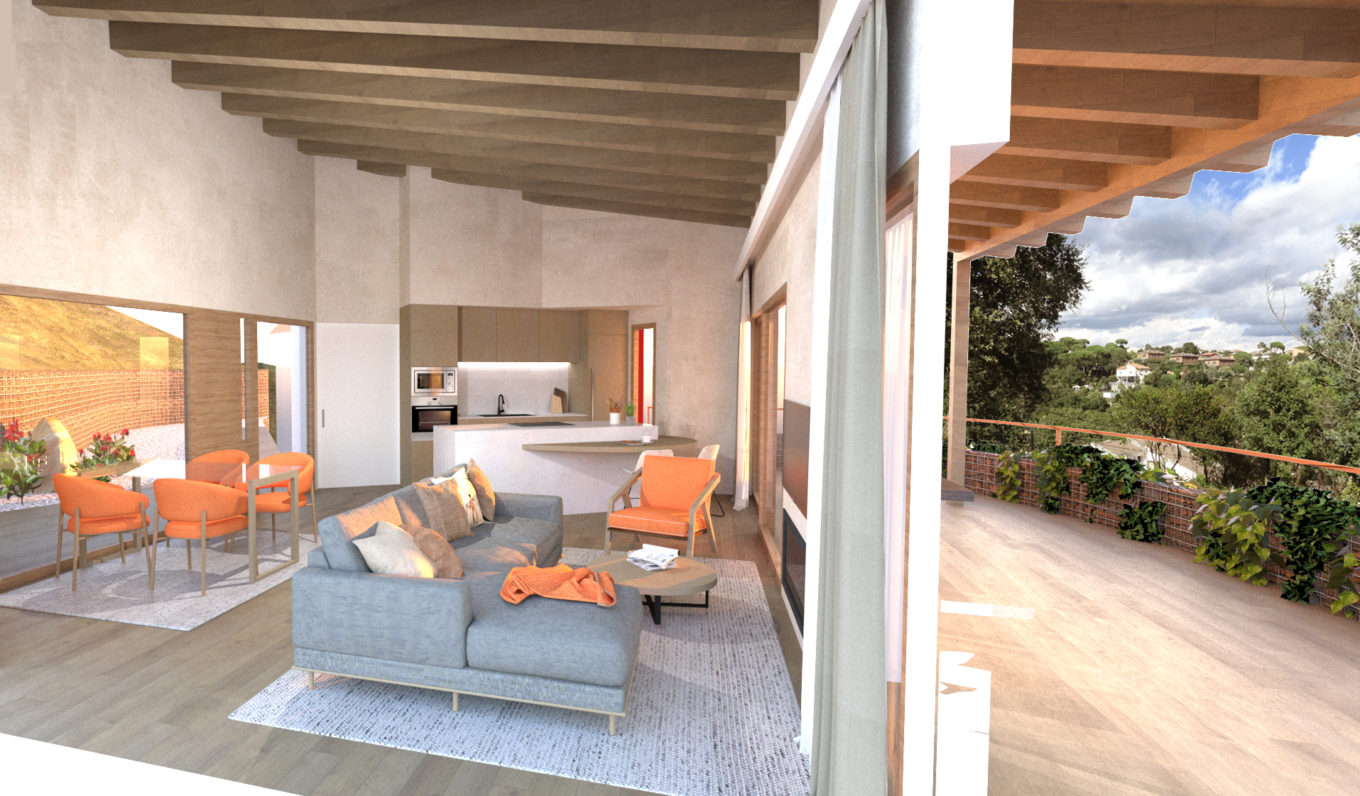 Teniendo en cuenta el conjunto de esta volumetría, similar a la de un arco que se abre hacia las vistas, en la fase de proyección se ha dado mucha importancia a las aberturas y a la configuración de las fachadas para que el espacio central tenga un carácter único y garantice una continuidad visual con la terraza exterior.