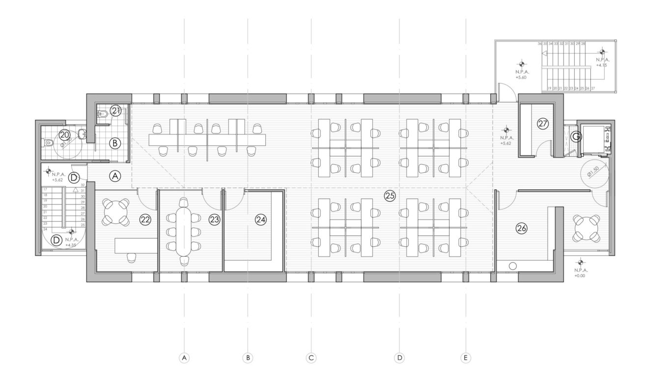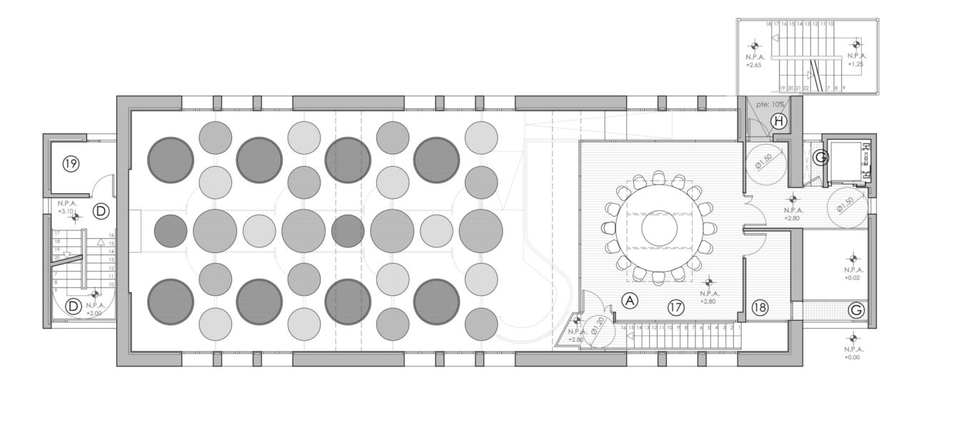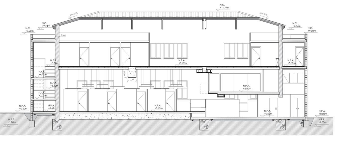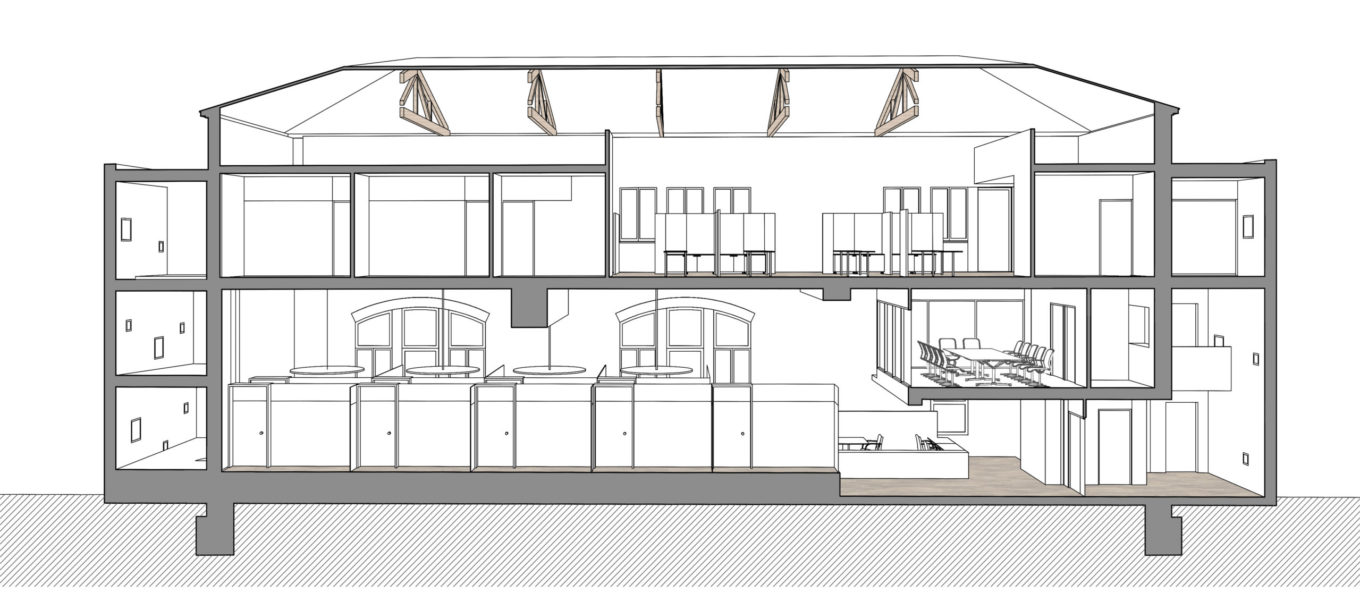 El proyecto se ha ubicado en el cuerpo principal del edificio, un volumen rectangular de dos plantas coronado con una cubierta de madera, manteniendo el lenguaje arquitectónico de la envolvente.