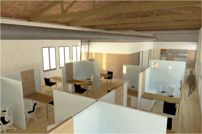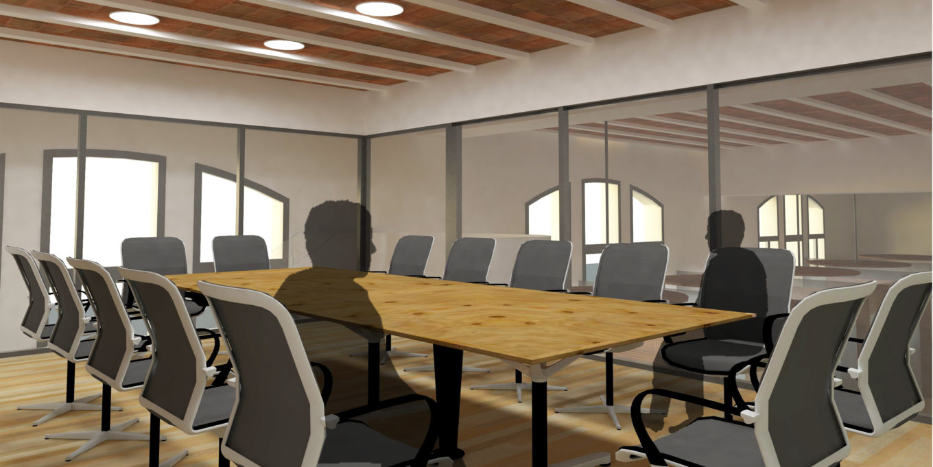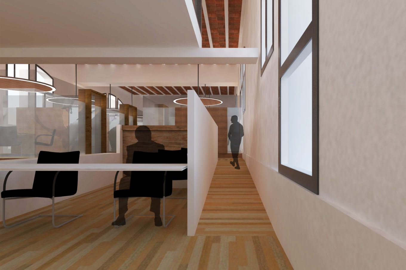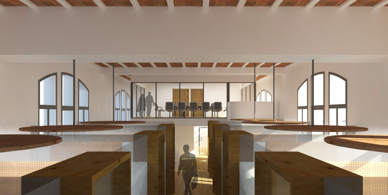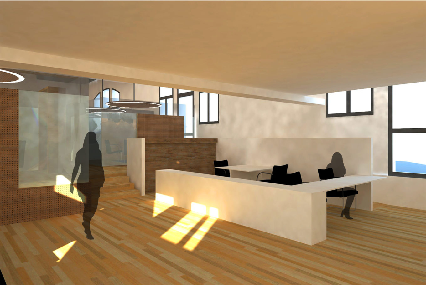 En la planta baja se han situado los despachos de atención a la ciudadanía, por lo que en este nivel se han diseñado los espacios con un carácter más privado. En la planta primera, por lo contrario, se sitúa la sala de trabajo interna, por lo que se ha planteado un espacio más abierto y diáfano. Entre ambas plantas se ha añadido un nivel intermedio, donde se ubica una sala de reuniones con vistas sobre el nivel inferior.