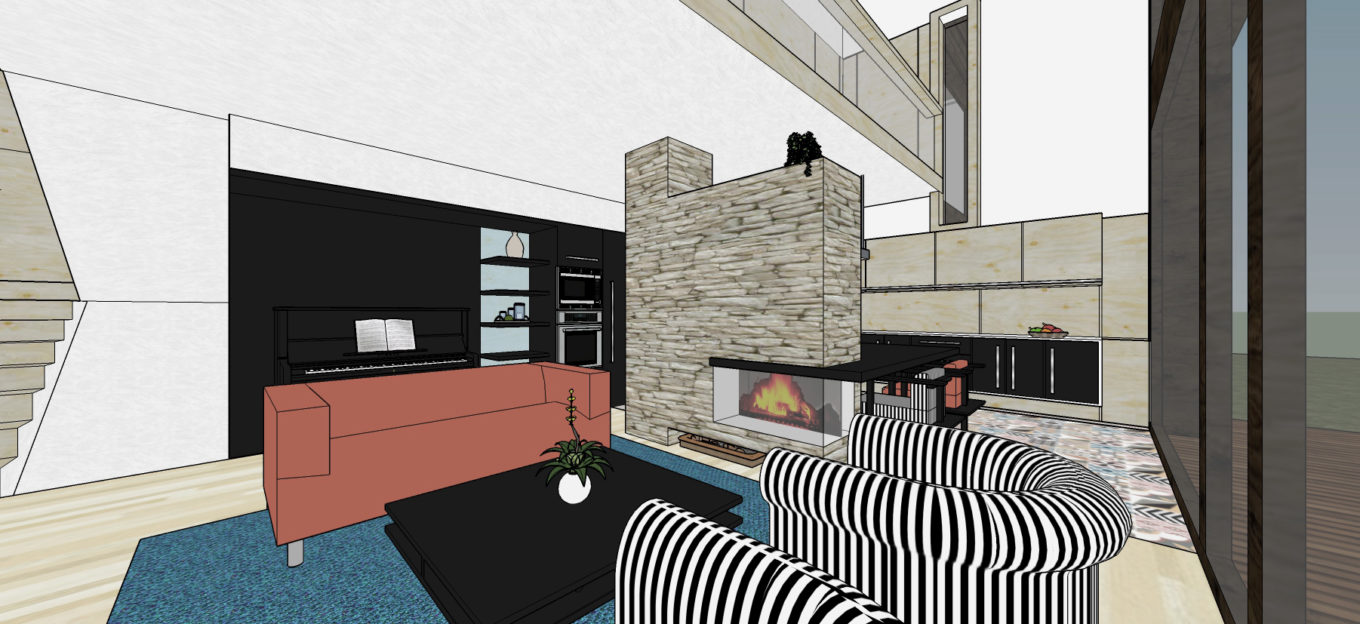 La vivienda se ha resuelto en un volumen rectangular que distribuye el programa de día y de noche entre sus dos plantas habitables. Aunque el edificio aparece como un volumen relativamente compacto que va acomodándose en el terreno, en el interior de la vivienda se plantean espacios a doble altura que permiten una comunicación directa entre los distintos espacios del programa.