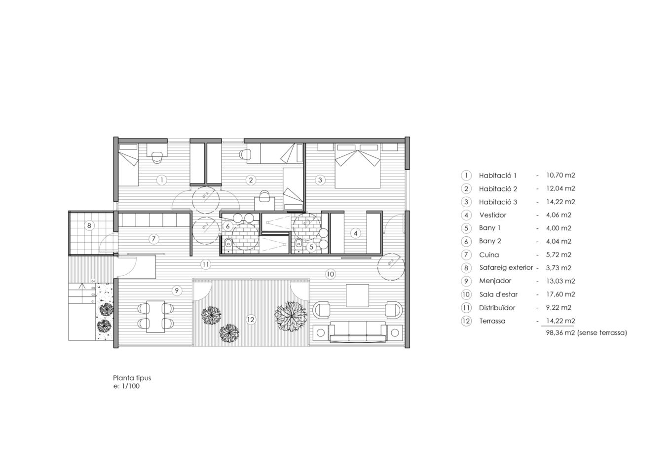 El diseño de la vivienda se plantea en forma de C, estableciendo el programa residencial alrededor de un núcleo de servicios. En el centro de la propuesta, además, se ha establecido un porche que protege de la radiación solar y permite que los espacios disfruten de un ámbito intermedio.