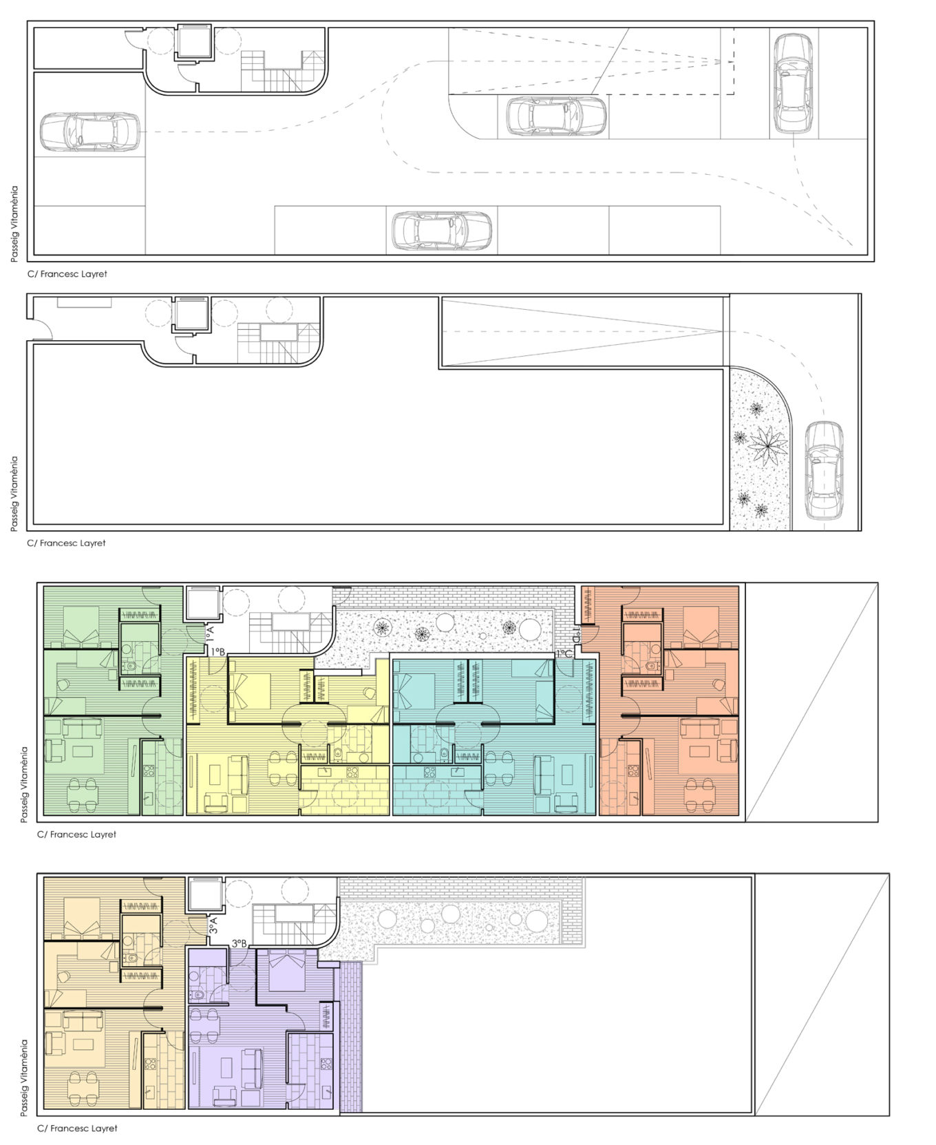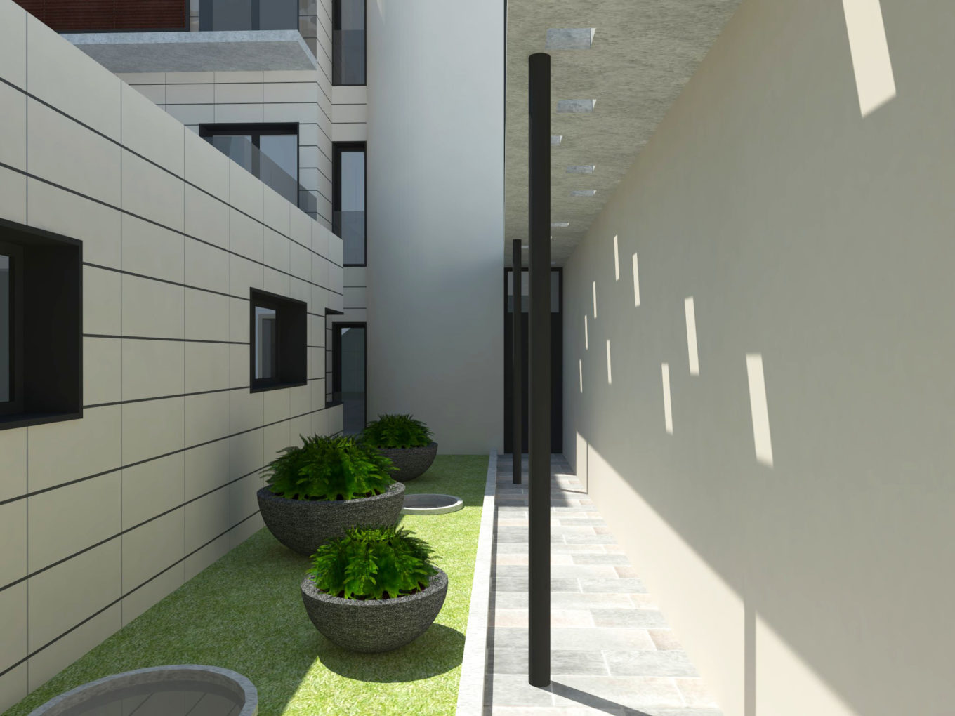 El edificio se alza alrededor de un patio central que, aparte de garantizar los requisitos urbanísticos, permite el acceso a ciertas viviendas de la planta primera mediante una pasarela flotante. Este espacio exterior, además, asegura que las distintas viviendas disfruten de ventilación e iluminación natural.