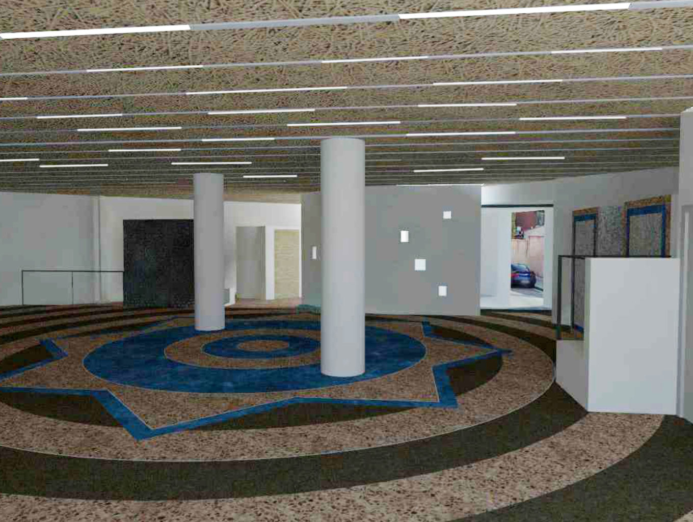 En esta intervención se ha dado importancia al interior, tanto a nivel de distribución como a nivel de acabados. Se ha planteado la redistribución del espacio en 4 estancias, donde destaca la gran sala de culto. Justo en este espacio, se ha diseñado un pavimento hidráulico para subrayar la simbología religiosa del edificio.